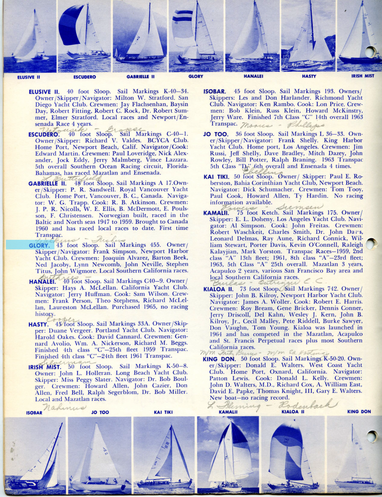 During the sixties Glory found herself on the west coast and belonged to Frank Simpson III and sailed out of Newport Harbor Yacht Club. Frank sailed in local Southern California races and enjoyed sailing Glory with his family. In 1965 he entered Glory in the transpacific race Transpac.